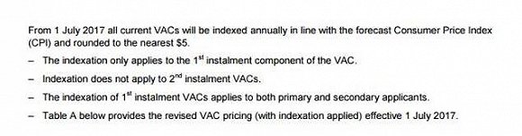 這意味著從今年7月1日起,所有的簽證費用將根據(jù)預(yù)測的消費者物價指數(shù)進行調(diào)整。簽證費每年都將按指數(shù)計算,并四舍五入至最接近的5澳元。這一指數(shù)化只適用于第一和第二申請人簽證費的首期付款,不適用于簽證費的第二期付款。