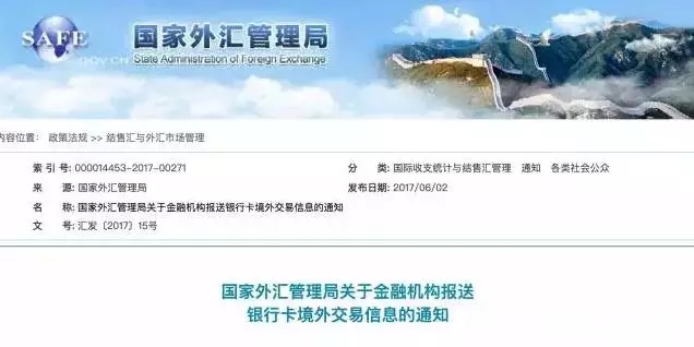 6月2日,外管局官方網(wǎng)站發(fā)布了《國家外匯管理局關(guān)于金融機構(gòu)報送銀行卡境外交易信息的通知》,通知寫道,為加強銀行卡境外交易監(jiān)測管理,維護銀行卡境外交易秩序,外管局決定開展銀行卡境外交易信息采集工作,自2017年9月1日起施行。