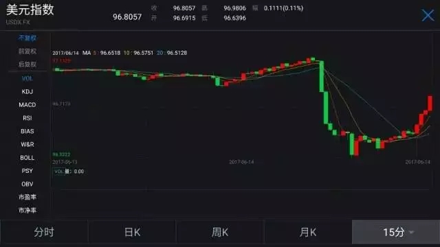 在市場表現(xiàn)方面(以下市場表現(xiàn)均截至北京時間3:30分),與今年3月加息時的走勢相似,美元指數(shù)再次出現(xiàn)大幅波動的情況。在美聯(lián)儲公布利率決議前半個小時左右,美元指數(shù)突然出現(xiàn)大幅跳水,一度從97.07點跌至96.32的低點。在耶倫新聞發(fā)布會開始后,美元指數(shù)快速反彈至96.81點附近。